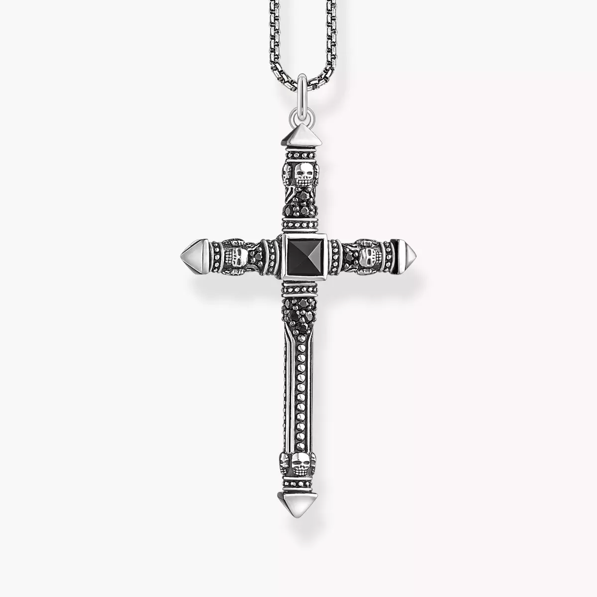 Show your inner rebel: recycled 925 sterling silver and black stones create the expressive look of this necklace with pendant for men. A detailed worked cross forms the eyecatcher of this jewellery-set. Small skulls and fine dot-structures are worked masterful into the pendant. Black zirconia stones underline this artwork. Right in die middle of the pendant, a dark-black onyx in pyramidal cut underlines the inner rebel. This shape can be found in all four ends of the cross. Adjust it easily from 45 to 50 cm.