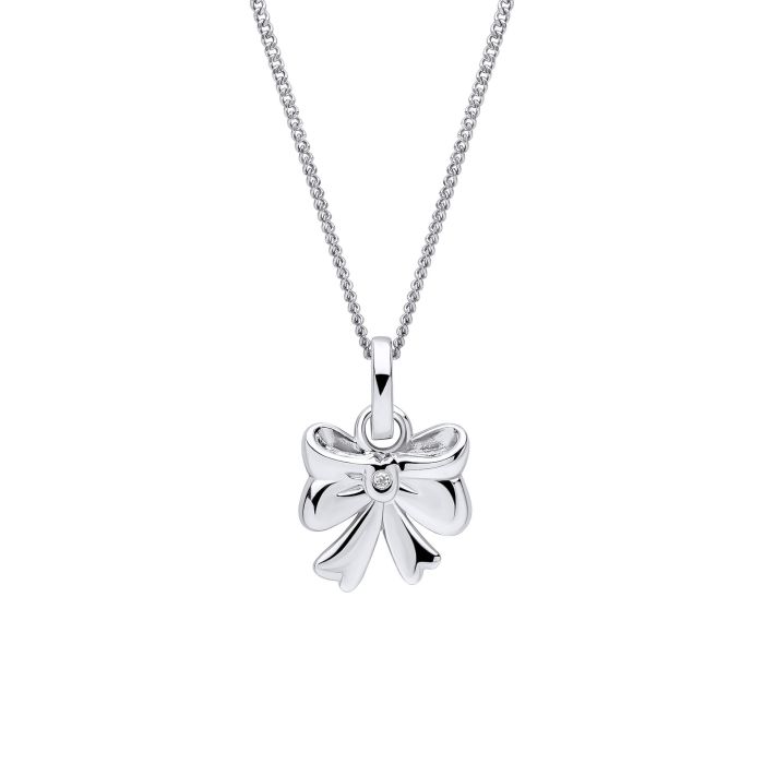 This sweet pendant captures the charm of a delicate ribbon tied into a perfect bow, symbolising celebrations and treasured moments. Crafted from recycled sterling silver with a luminous platinum plating, the bow is adorned with a twinkling diamond at its centre, adding a touch of magic. A timeless gift for birthdays, christenings, and special milestones, this pendant can be paired with the matching stud earrings for an enchanting set to cherish forever.