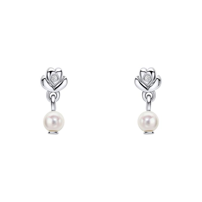 Celebrate life’s precious moments with these stud earrings, beautifully crafted from recycled sterling silver with a radiant platinum plating. Designed with a delicate heart-shaped flower bud, each earring features a twinkling diamond at its centre, while a lustrous freshwater pearl gently sways below, adding a touch of timeless elegance. Perfect for marking milestones such as birthdays and christenings, these dainty earrings are a cherished keepsake to treasure for years to come, especially when paired with the matching pendant for a beautifully coordinated look.