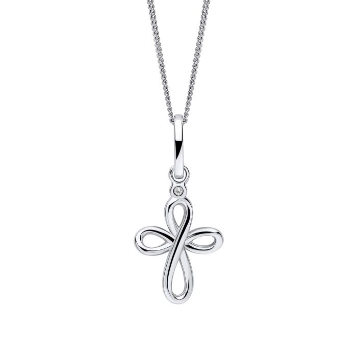 A symbol of love and faith, this cross pendant is a beautifully delicate piece, perfect for celebrating life’s special moments. Crafted from recycled sterling silver with a radiant platinum plating, its graceful open design flows effortlessly, whilst a brilliant diamond at the top adds a subtle sparkle. Designed for little ones to treasure, this pendant makes a thoughtful gift for christenings, birthdays, or special milestones, offering a timeless keepsake to cherish.