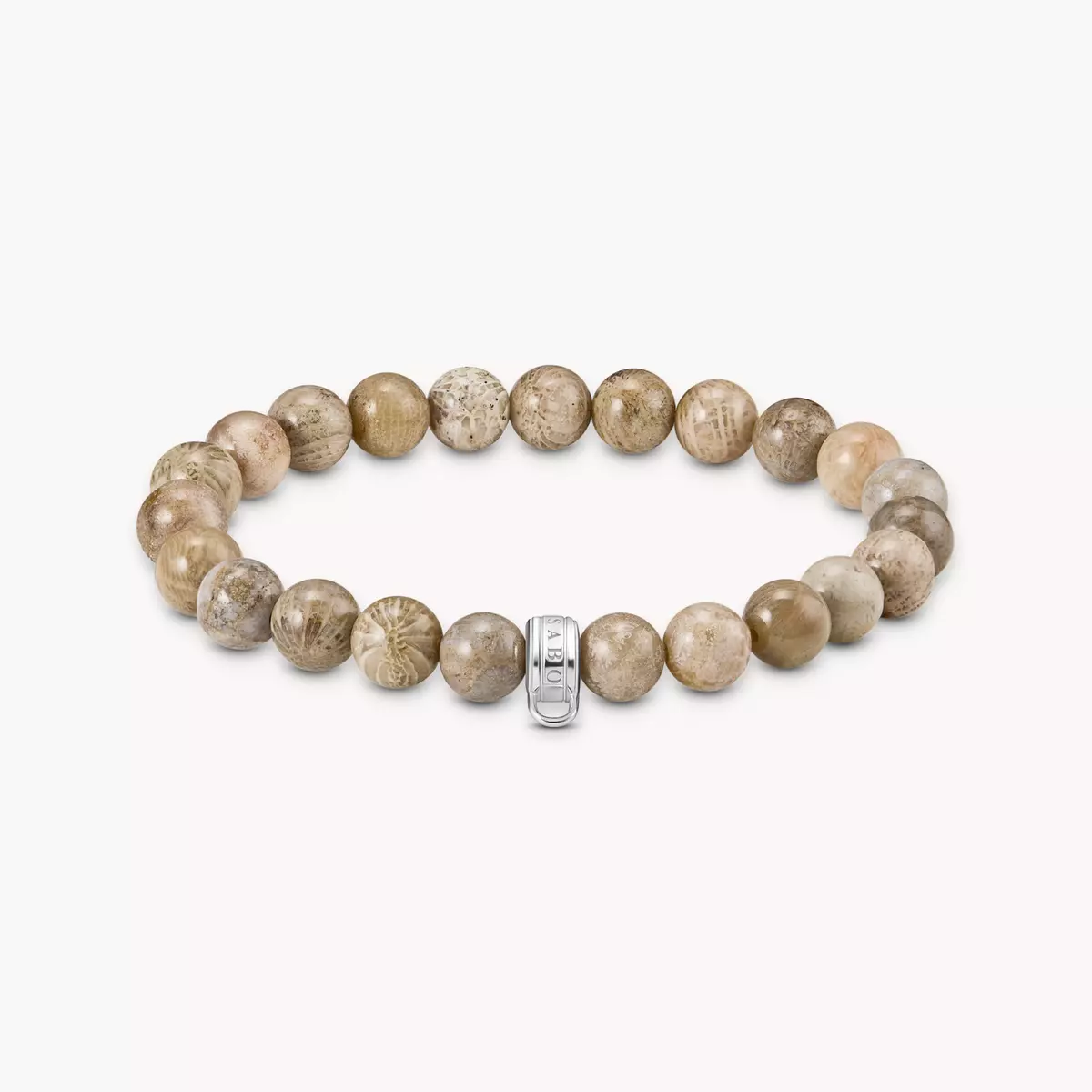 A must-have for every fashion lover: this elastic stone bracelet consists of beads made of round polished, light daisy jasper. The eye-catching colour draws all attention to your wrist and makes you dream of your dream vacation by the sea. A CHARM CLUB logo ring made of recycled 925 sterling silver is the centre piece between these beads. On its eyelet, you can attach up to three charm pendants and tell your own story with this bracelet. The beads bracelet is available in different lengths.